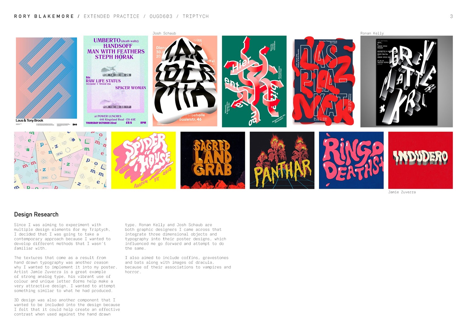 My overall aim of utilising the Triptych brief to experiment with various elements and take a contemporary approach with the poster design has been achieved, especially since 3D items, hand rendered text, half tone and duo tone were incorporated into the final poster design. I valued this project because of the new methods I learned whilst working with different softwares and how I could transform my own hand drawn type into a digital realm and present it effectively. learning how to amalgamate different elements within a design has been very beneficial too as it's something I plan on developing within other projects. Digital print was used to print my design for because it involved a lot of editing and would be near impossible to complete as a screen print. The quality of the final print is great, however after changing the colour mode to CMYK the pink Dracula image lost quite a bit of vibrance and appeared less pink, although it still came out looking good. However, if I had more on the Triptych poster I would of loved to of incorporated more hand drawn type, I feel that there are some vacant spaces on my design that could of been filled up with some different components relating to the Dracula film. I also believe that each of our Triptych designs have been successful in informing the audience about an event that happened on the 15th of february. The three of us have produced a very strong set of posters for Triptych, which look great together.